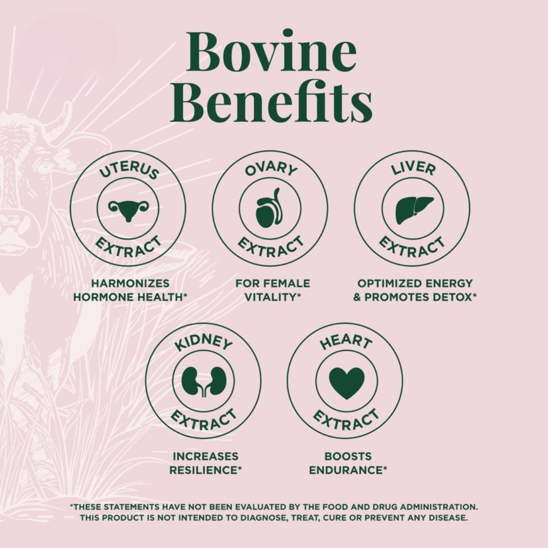 Our formula includes: bovine liver, kidney, heart, ovarian tissue, bamboo leaf extract (silica), ascorbyl palmitate, and gelatin capsules. That’s it — no fillers or synthetic additives.